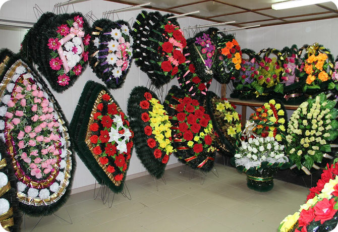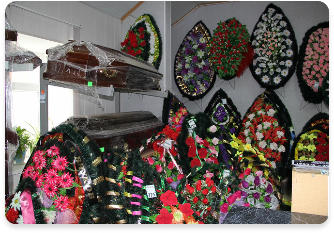 Для приобретения всего необходимого перечня ритуальных товаров по низким ценам (гроб, крест, покровцы, одежда для умерших, венки, ленты и т.д.).